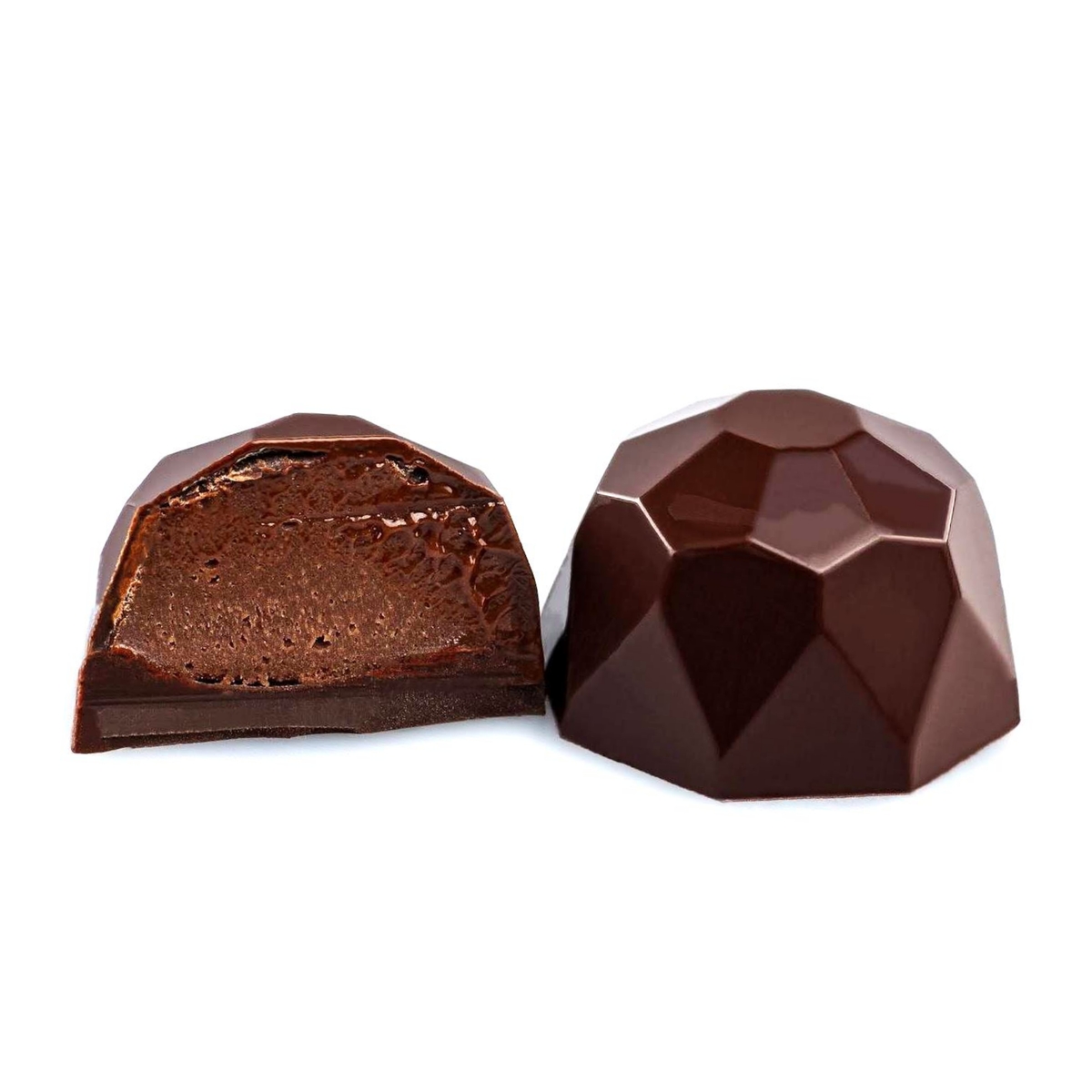 Un diamant extravagant făcut cu pasiune dintr-un ganache de ciocolată neagră, piure de zmeură și un fir de șofran, pregătit să fie admirat și savurat cum se cuvine.